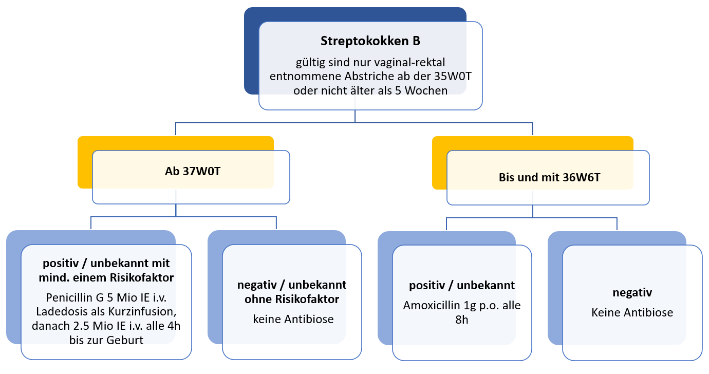 - Kein routinemässiges Streptokokken B-Screening bei 35 - 37 SSW.